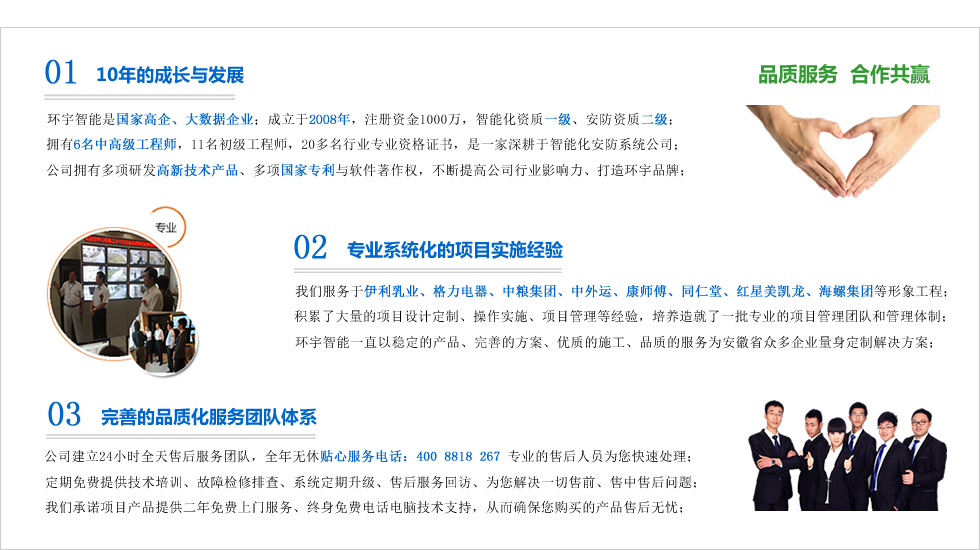 合肥市環(huán)宇智能工程有限公司成立于2008年,科創(chuàng)版上市企業(yè),現(xiàn)注冊(cè)資金1000萬元整,電子與智能化系統(tǒng)集成資質(zhì)壹級(jí),安防資質(zhì)貳級(jí),是“國(guó)家高新技術(shù)企業(yè)”、“合肥市高新技術(shù)產(chǎn)品認(rèn)定企業(yè)”、“安徽省安防協(xié)會(huì)會(huì)員單位”、“AAA級(jí)信用等級(jí)認(rèn)證企業(yè)”、“AAA級(jí)重合同守信用企業(yè)”、“合肥市創(chuàng)新型企業(yè)”、是行業(yè)領(lǐng)先的智能化整體解決方案的集成商。
