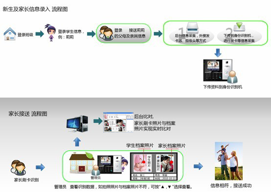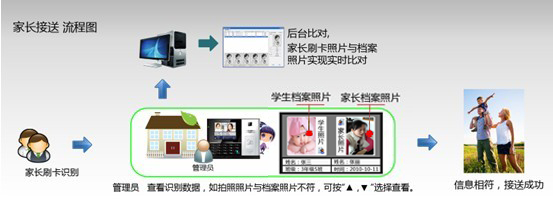 家長在門衛(wèi)處進入刷卡接送流程,同時信息可實時上傳到后臺,方便管理人員實