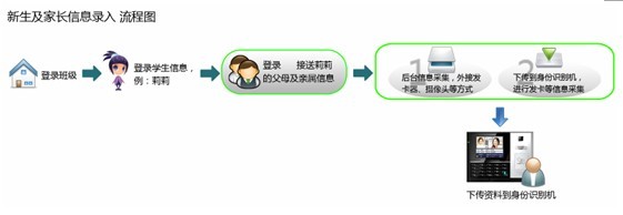 校園新生及家長信息錄入: 新生入學,學生與家長到校務辦進行信息采集。以本機采集為例,家長信息錄入以后傳輸?shù)阶R別機,然后在識別機上進行發(fā)卡及照片采集,采集完成后,軟件進行信息匯總,卡號及照片存入數(shù)據(jù)庫。后期可增加家長信息數(shù)量,大數(shù)量為10個。