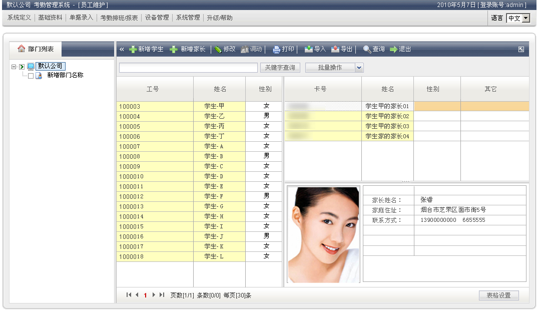 以學生和家長為基準,可實現(xiàn)“一對一”或“一對多”的卡片與家長對應方式,添加人員檔案可單個對指定班級添加人員,如果人員較多可成批導入人員檔案,如果有新增班級,系統(tǒng)自動創(chuàng)建新增班級并包含人員檔案。