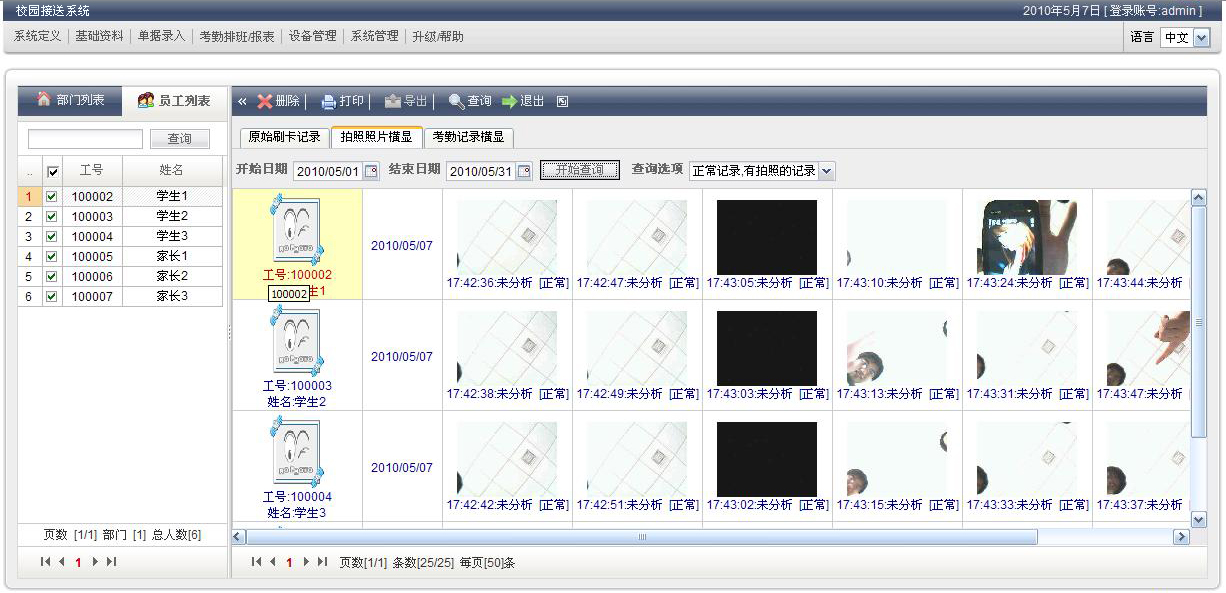 家長接送: 設備安裝于門衛(wèi)室旁,家長進門時,首先進行刷卡,家長刷卡以后,管理員現(xiàn)場查看刷卡信息,比對照片,如與檔案照片不符(因小孩可能對應多位家長接送),則按“↑”與“↓”鍵,查看所屬其他家長照片,查到該家長照片則完成接送。 后臺管理員可實時查看刷卡數(shù)據(jù),實現(xiàn)實時查看。