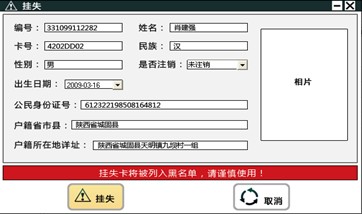 點擊“掛失”項,會顯示該人員檔案信息,確認無誤以后,點擊“掛失”項,系統會把該人員列入黑名單