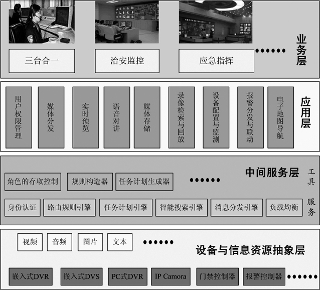第四層為設備與信息資源抽象層,實現了安防設備和音視頻、圖片和文本等信息的歸納抽象,并接入到平臺進行集成管理,使用戶無需關心所使用的設備和信息資源的具體位置和形態,便于設備信息資源的組織和調度,更好的為業務服務。