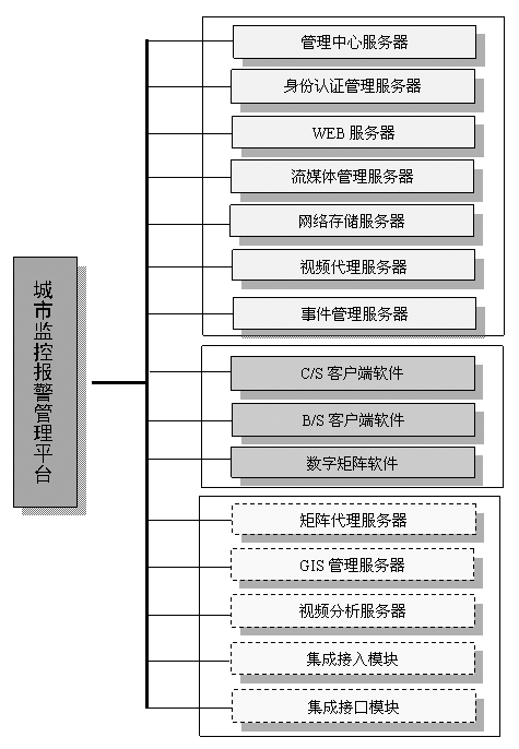在10000路以上大規模系統中,則需要在各分局分布部署流媒體和集中存儲,市局只部署管理中心服務器和其它全局公用的服務器,如GIS服務、集成路由服務器等。