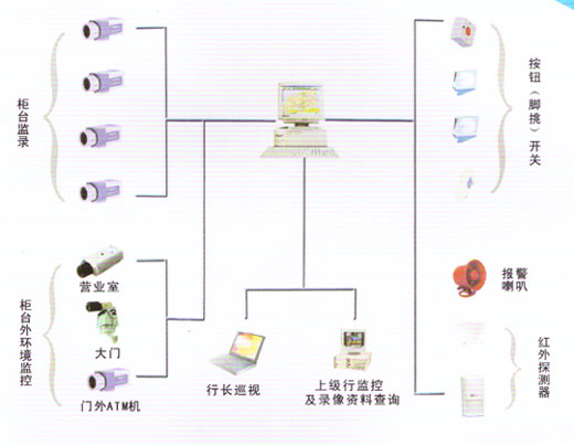 可選配移動檢測報警、探測器報警、網絡監控和云臺鏡頭控制等功能,將銀行保安監控、中心監控、分控和柜員制監控合而為一,組成完整的大型網絡化綜合性監控系統。