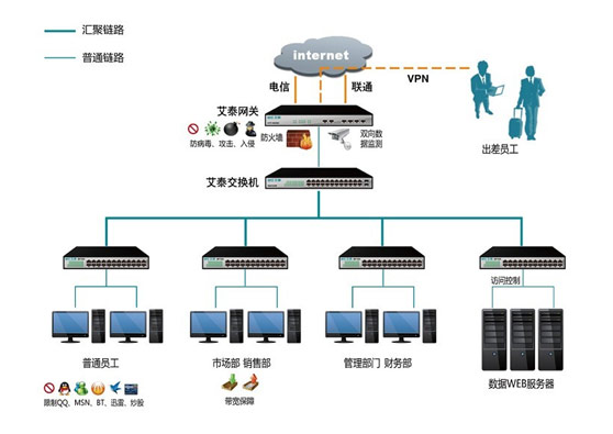 上網(wǎng)行為管理:隨著網(wǎng)絡(luò)中各類熱門應(yīng)用的頻繁出現(xiàn),不加管控的網(wǎng)絡(luò)已經(jīng)給中小型企業(yè)帶來了不少困擾,員工上網(wǎng)聊天、炒股、在線視頻等網(wǎng)絡(luò)活動,影響了網(wǎng)絡(luò)資源,降低員工的工作效率,在一些關(guān)鍵部門,還帶來了不少的信息安全隱患。因此中小型企業(yè)在建設(shè)網(wǎng)絡(luò)的時候,需要很好的管控員工上網(wǎng)行為,成為中小型企業(yè)的首要任務(wù)。