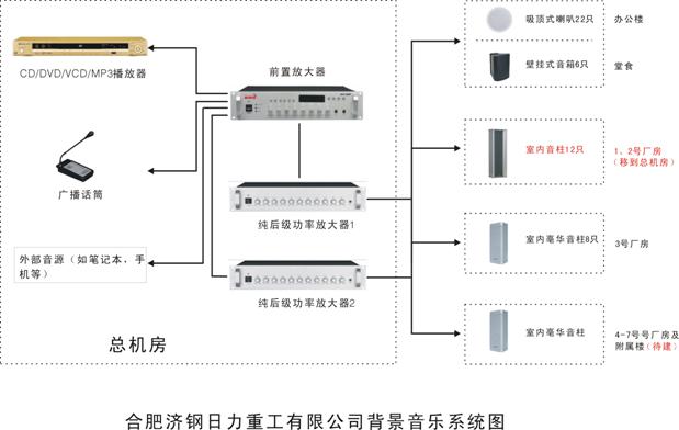 本次設(shè)計的背景音樂系統(tǒng)具有背景音樂廣播、公共廣播、語音廣播等功能。由音源、功率放大器、廣播話筒、揚聲器等構(gòu)成。該系統(tǒng)用于整個辦公樓,生產(chǎn)車間,平時可在公共區(qū)域播放背景音樂。所有背景音樂自動循環(huán)播放,發(fā)生火災(zāi)時,可人工控制兼作事故廣播使用,指揮疏散。系統(tǒng)的設(shè)計,必須考慮使用場所的特性、噪音水平、空間大小高度,并根據(jù)揚聲器的擴散角度、聲壓等級和額定輸入功率,確定揚聲器的數(shù)量。根據(jù)公共廣播系統(tǒng)的功能要求,播放的音樂必須以聽音樂的人意識不到聲源的位置,具有刺激性小的使人快感的音質(zhì);進行公共廣播時,是以聽音的人能聽到清晰、準(zhǔn)確的聲音為設(shè)計目標(biāo)。