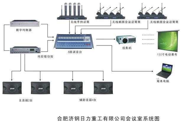 音箱是按照聲場均勻的擺放設(shè)計,主音箱采用主音箱吊掛在會議臺口上兩側(cè),會議室上擺放兩返聽音箱用于會議室返送,會議室兩側(cè)和后面壁掛安裝四還繞音箱。