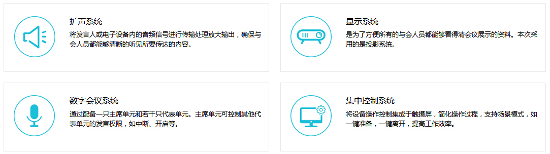 會議是日常工作環境中不可缺少的一個環境,本方案致力于解決會議系統的基本需求,但在滿足基本需求的條件下,提供可選配置,用于補充會議系統某些方面的需求。