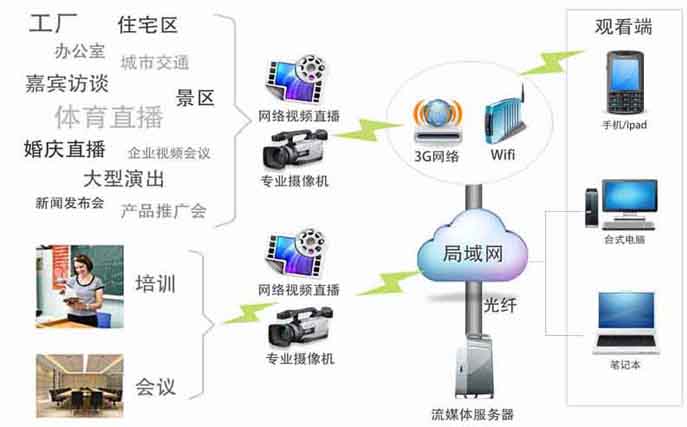 手機視頻直播系統(tǒng)是無線網(wǎng)絡(luò)技術(shù)應(yīng)用多的領(lǐng)域之一。手機視頻直播系統(tǒng)主要用于對重要區(qū)域或遠程地點的監(jiān)督和控制(如工廠、辦公室、住宅區(qū)、景區(qū)、城市交通、體育直播、婚慶直播、企業(yè)視頻會議、新聞發(fā)布會、產(chǎn)品推廣會、大型演出、嘉賓訪談等),視頻直播系統(tǒng)將被監(jiān)控點實時采集的視頻文件及時地傳輸給監(jiān)控中央,實時動態(tài)地講演被監(jiān)測點的情況,及時發(fā)現(xiàn)問題并進行處理。